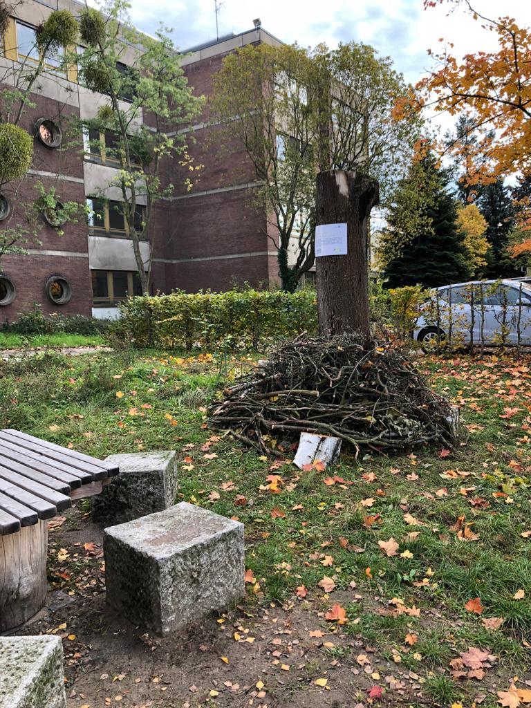 Als Initiative haben wir eine ellipsenförmige Benjes- oder Totholzhecke angelegt. Dafür haben wir Gehölz-, Strauch- und Baumschnitt übereinandergestapelt. Dabei wurden im Wechsel dickere und dünnere Äste und Zweige in Linien locker übereinandergeschichtet. So entsteht ein vielseitiger Schutz-, Nahrungs- und Lebensraum für Vögel, Igel, Kröten und Insekten!