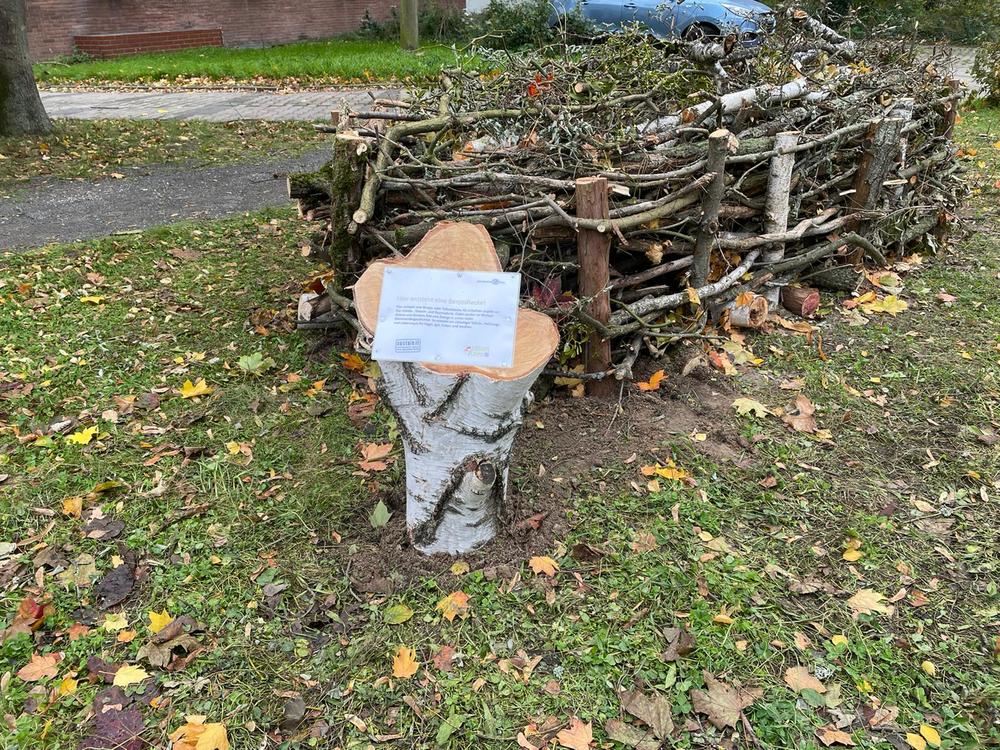 Mit Nisthilfen aus Schilfröhrchen, Totholz und einer Lehmwand für Wildbienen, einer Benjeshecke aus Totholz, einem wilden Blühstreifen, einem alten Baumstumpf sowie kleineren Reisig- und Totholzecken zeigen wir ganz praktisch, wie auf kleinster Fläche Lebens-, Brut- und Nahrungsräume für verschiedene Insekten, Vögel, Igel und andere Tiere geschaffen werden können.