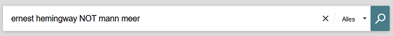 Der NOT-/ NICHT-Operator schließt Suchbegriffe von der Suche aus. In dem Beispiel wird nach den Suchbegriffen Ernest und Hemingway gesucht, nicht aber nach Mann und Meer. Primo interpretiert die Suchanfrage somit folgendermaßen: (ernest AND hemingway) NOT (mann AND meer). Die Klammern setzt die Suchmaschine bei zwei Begriffen ohne Operator von selbst.