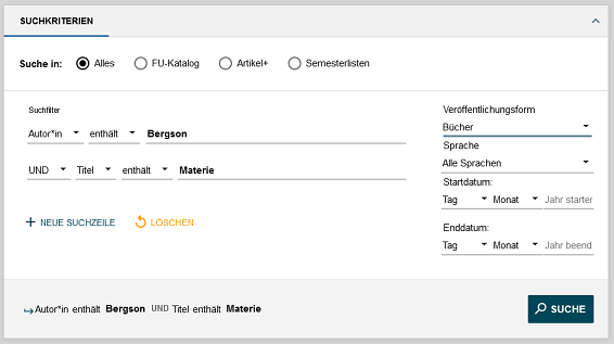 - Beispiel: Autor*in: Bergson - UND - Titel: Materie - Veröffentlichungsform: Bücher