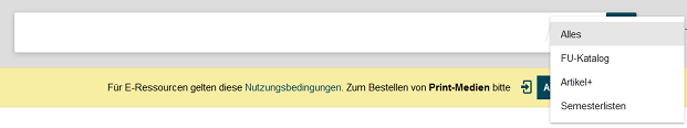 Sie können entscheiden, ob Sie die Suche auf den FU-Katalog oder Artikel+ begrenzen, oder im Suchbereich Semesterlisten recherchieren wollen. Die Auswahl wird Ihnen nach Anklicken des Lupensymbols oder nach der ersten Suche angezeigt.