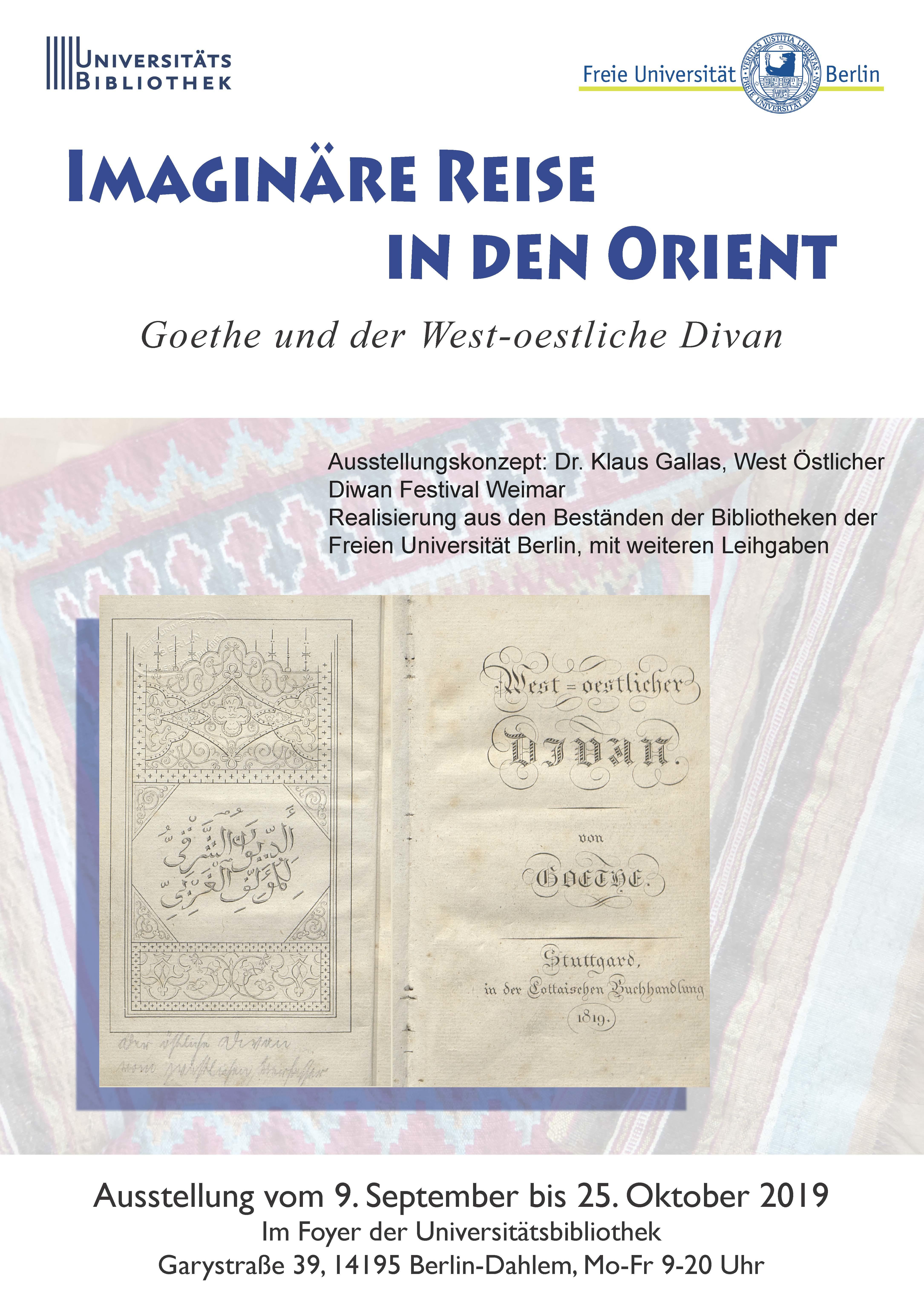 Zum 200-jährigen Jubiläum der Erstveröffentlichung von Johann Wolfgang von Goethes Gedichtsammlung „West-oestlicher Divan“ zeigt die Universitätsbibliothek der Freien Universität Berlin die Ausstellung „Imaginäre Reise in den Orient. Goethe und der West-oestliche Divan“. Sie wird am Montag, den 9. September 2019 eröffnet. Kuratiert wurde die Ausstellung von Dr. Klaus Gallas, Autor, Verleger und Kulturmanager aus Weimar. Der Eintritt ist frei.